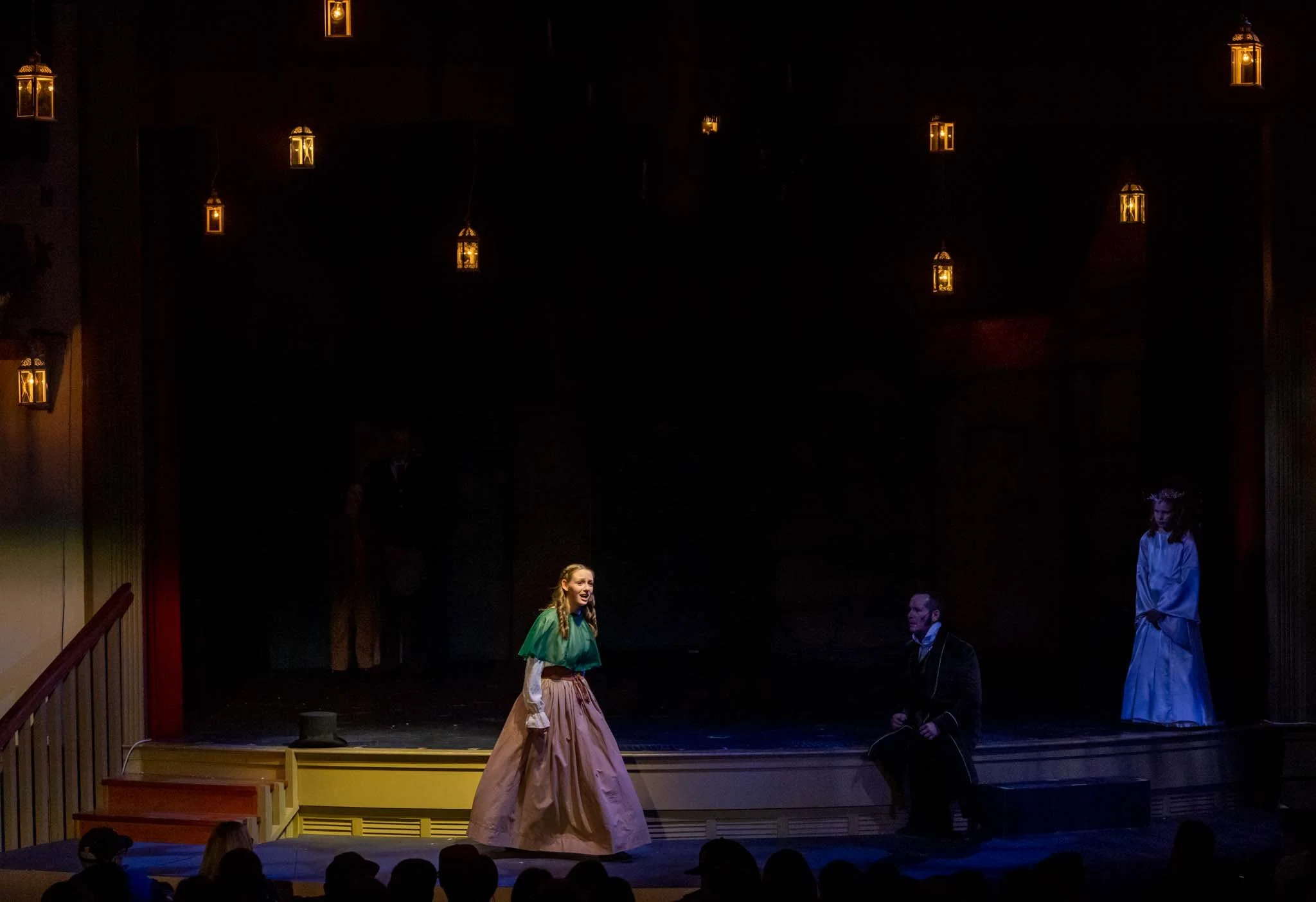 Actors performing in a theatrical play on stage with dim lighting, three hanging lanterns overhead, and a dark background with painted set pieces. One woman in a long skirt and green top is central, singing or speaking. To her right, a woman in a whi