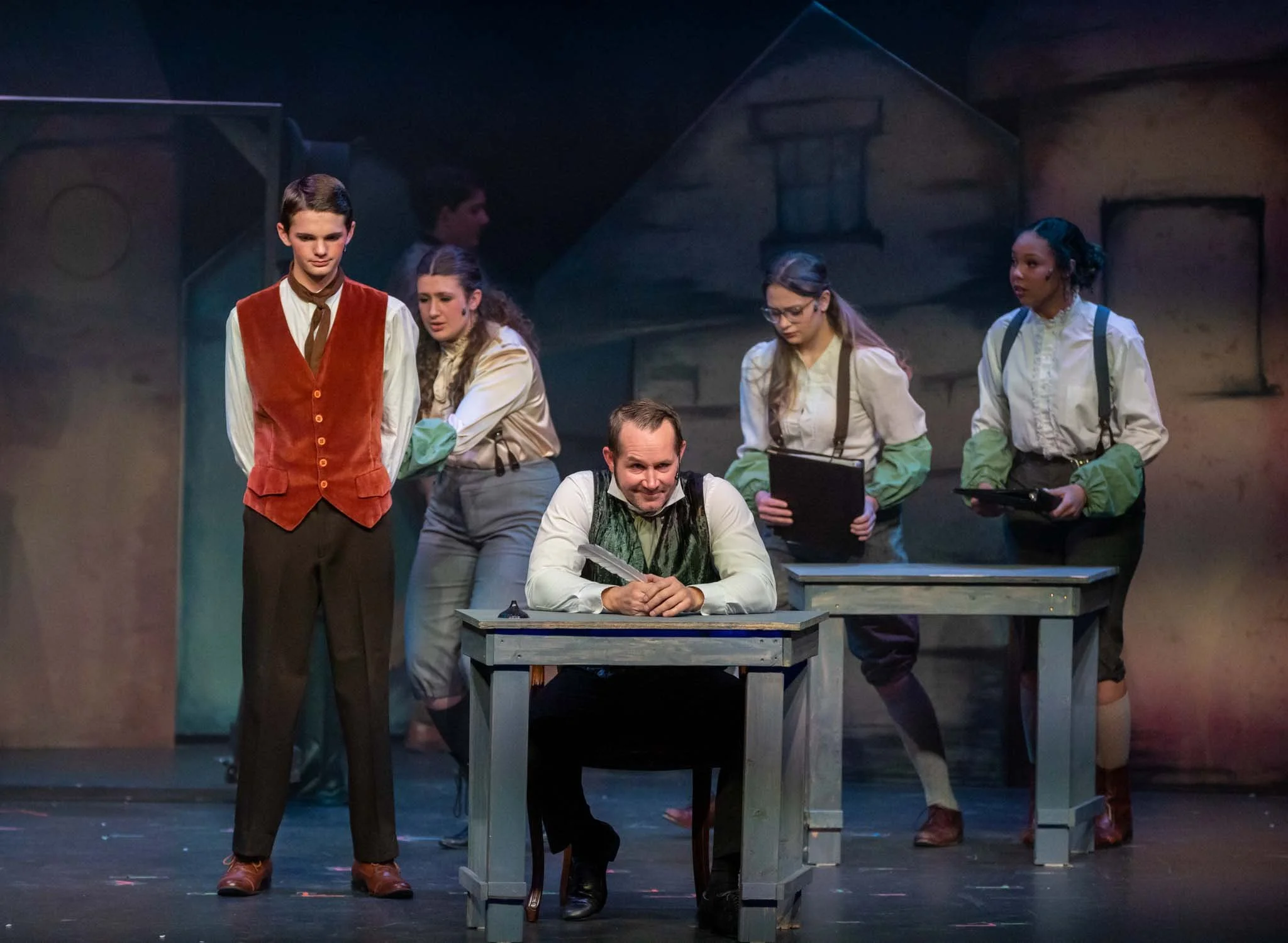 Actors in a theatrical production, with one person seated at a desk writing, and others standing and taking notes, dressed in period costumes.