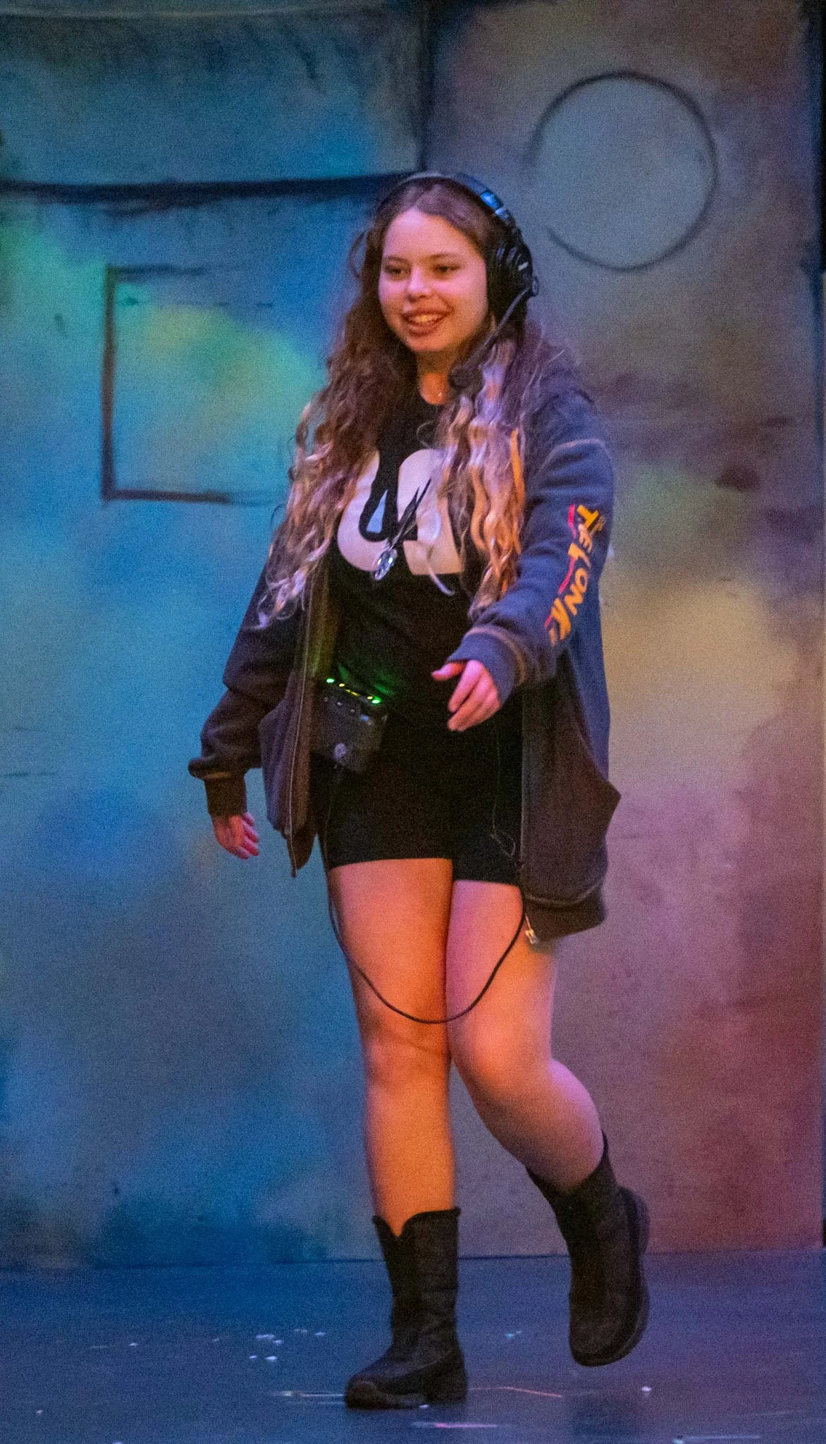 Young woman with long curly hair wearing a headset, sunglasses, a black t-shirt, a gray jacket, black shorts, and black boots, walking on a stage with colorful lights.