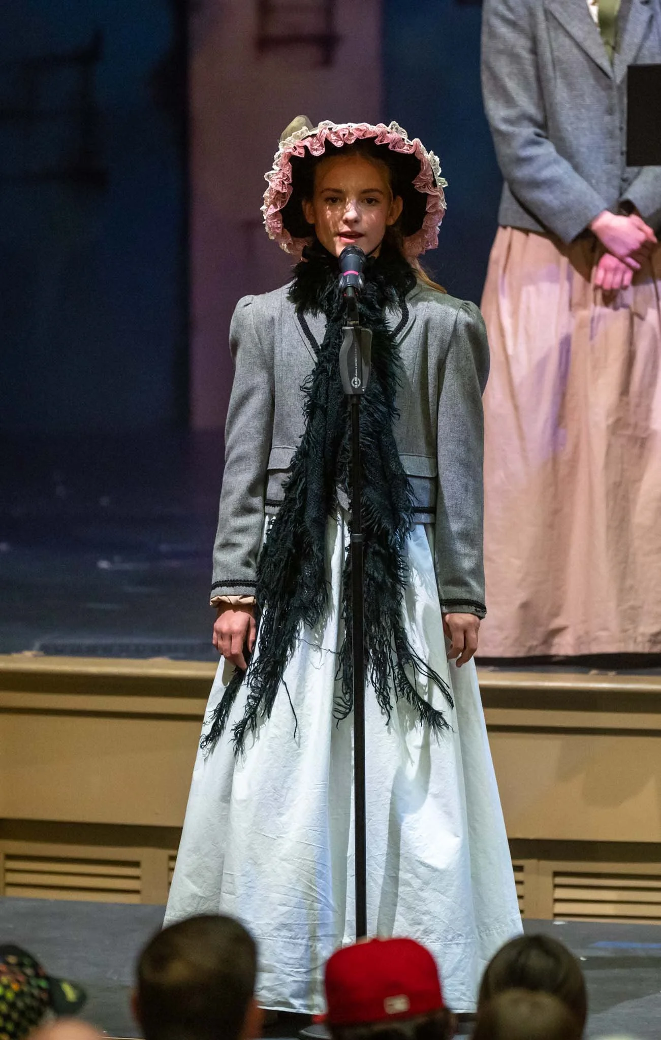 A girl dressed in historic clothing, including a bonnet and long dress, stands on stage speaking into a microphone, with other people partially visible in the background and audience members in the foreground.