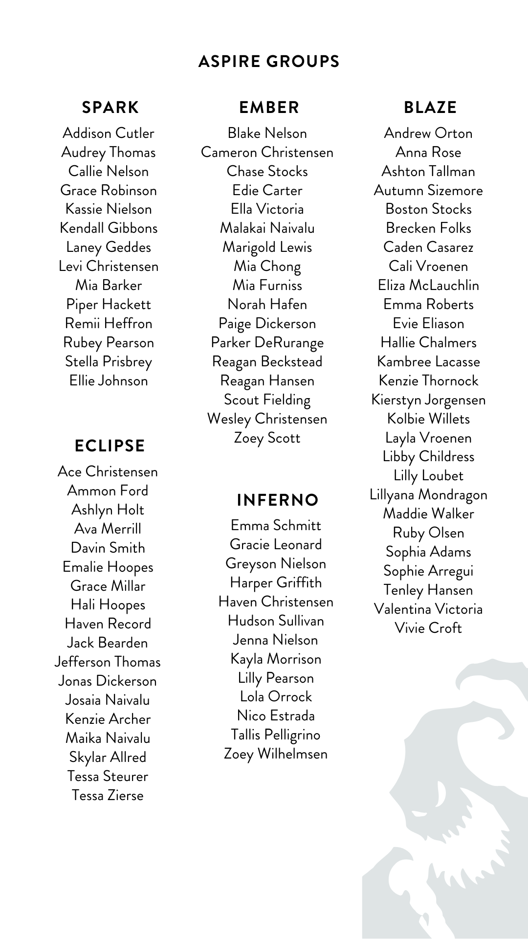 List of names categorized under Aspire Groups: Spark, Ember, Blaze, Eclipse, Inferno, with various names of individuals.