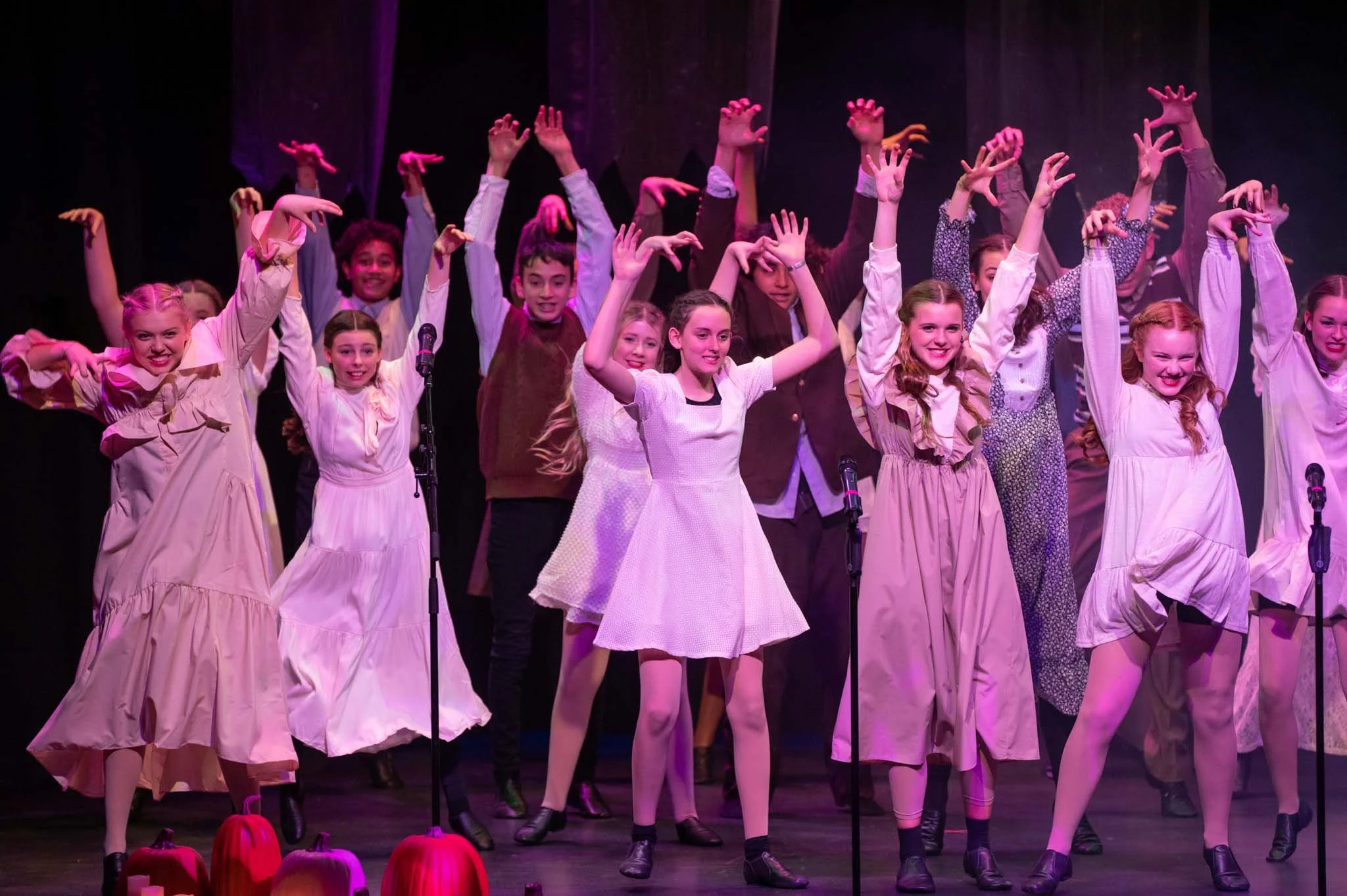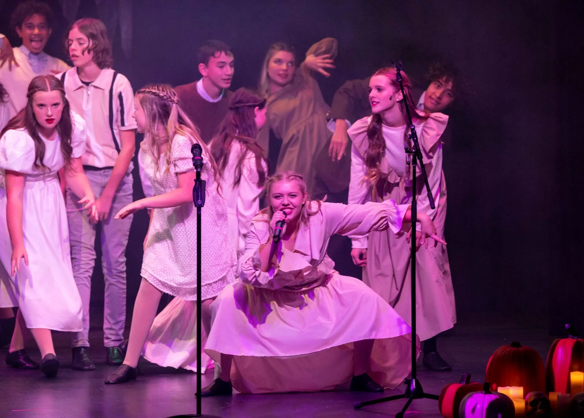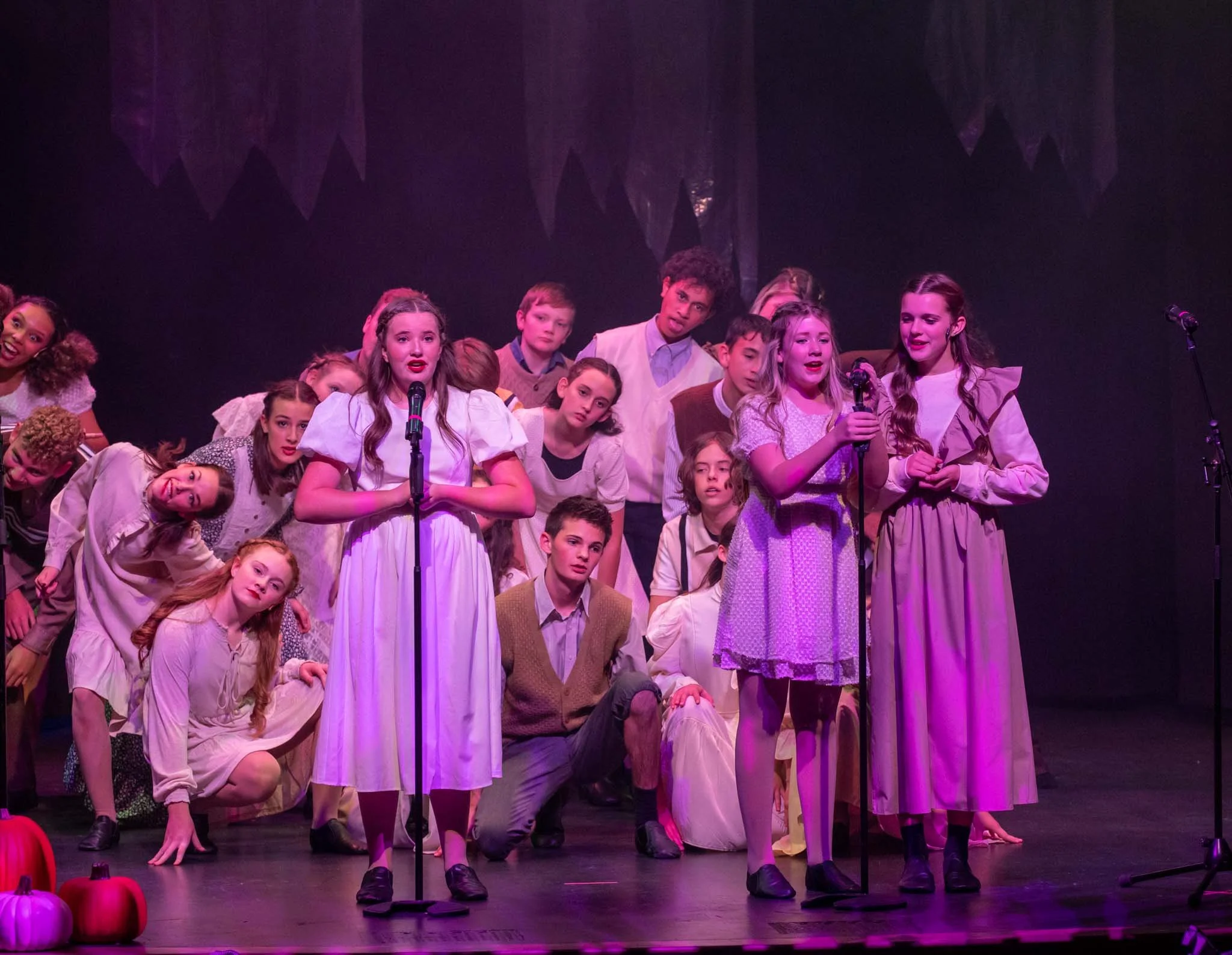 Girls in vintage-style dresses performing on stage decorated with pumpkins and candles, with a dark background and colored stage lighting.