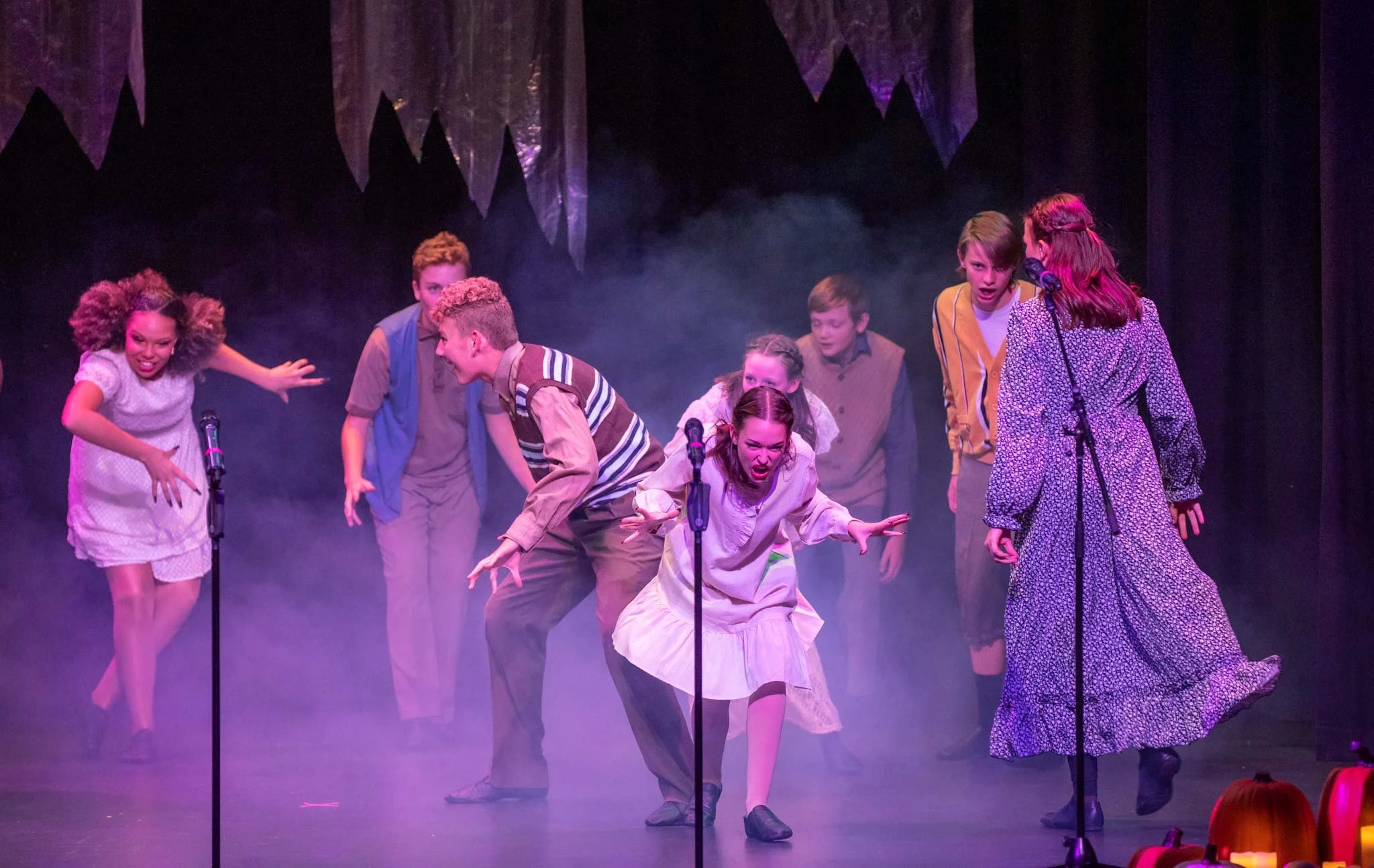Children performing on stage in a theater, with pumpkins and candles in front, under purple and pink stage lighting.