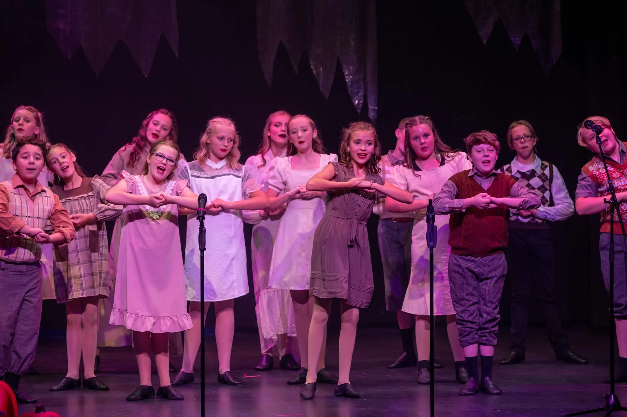 Children performing on stage during a theatrical play or musical, dressed in vintage-style costumes, with some singing into microphones.