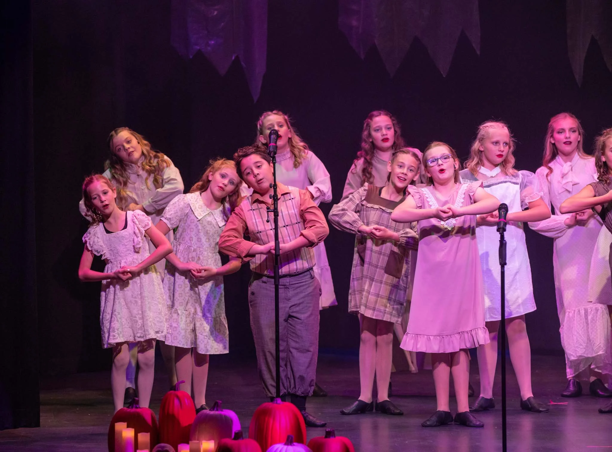 Children's theater production on stage with girls in dresses and boys in costumes, pumpkins and candles in foreground.