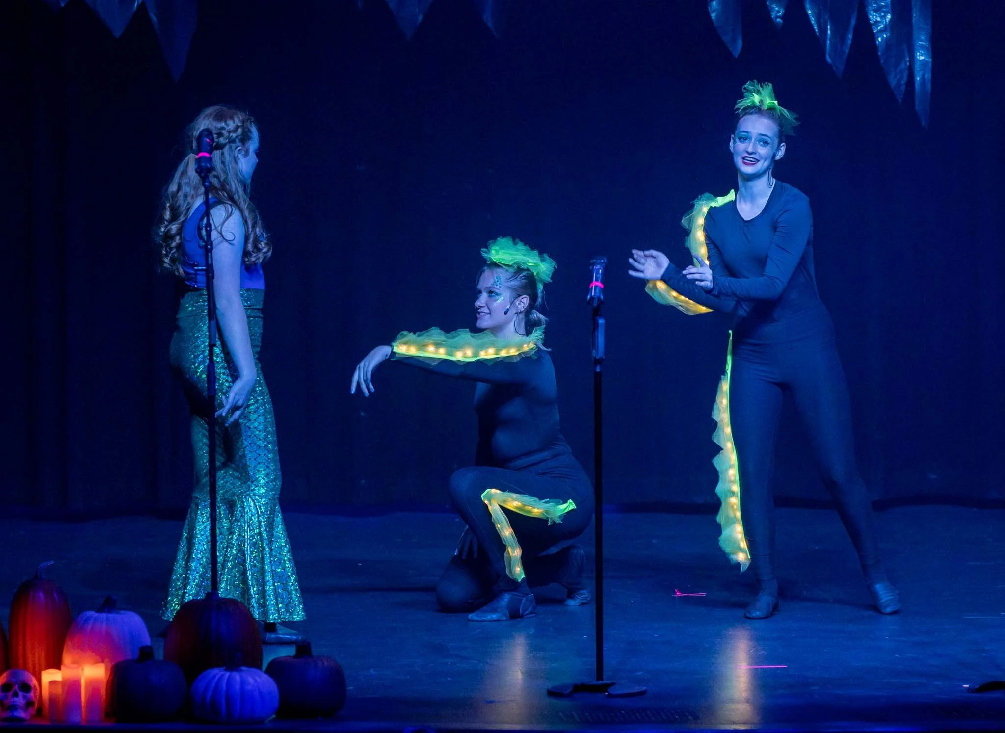 Three women performing on stage, wearing black and blue costumes with glowing yellow accents on their sleeves, and one woman in the center with a shiny blue and gold mermaid costume, in front of a dark background with hanging shiny decorations.