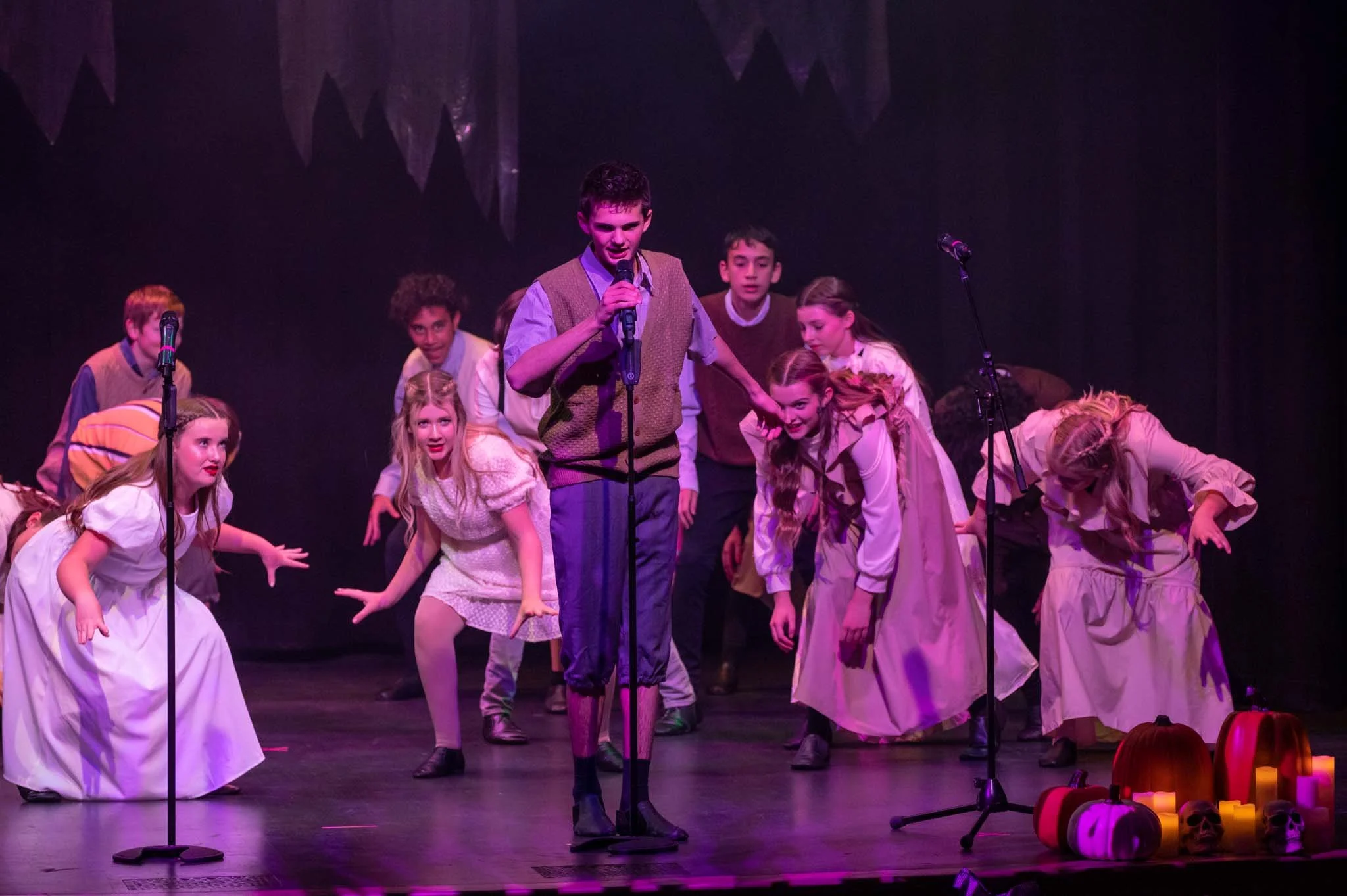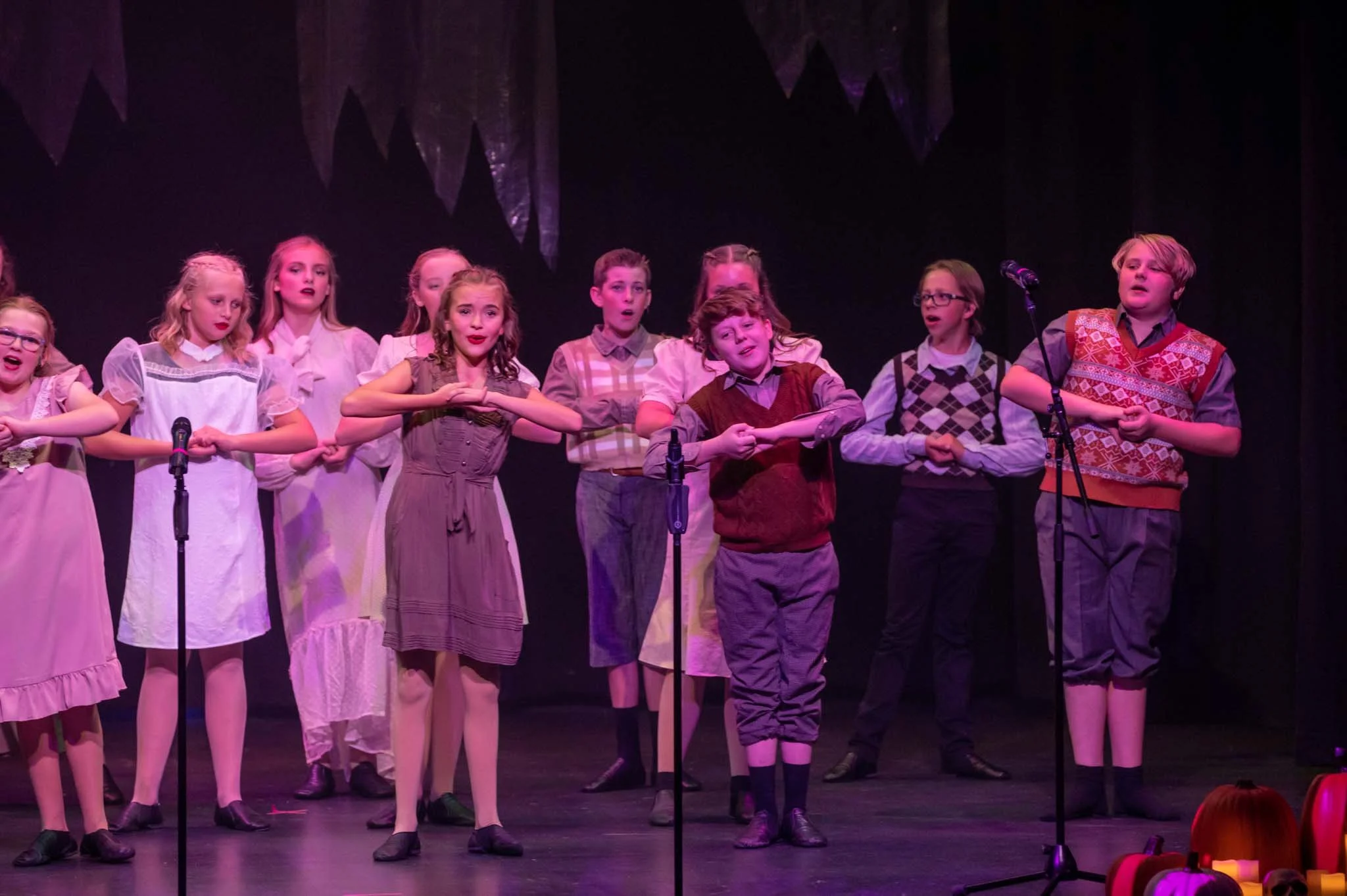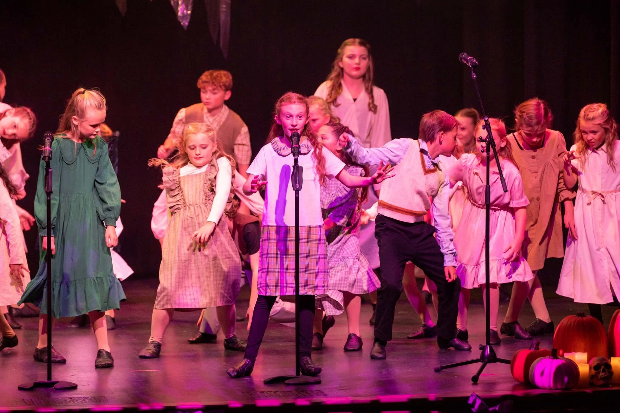 Children performing a play or musical on stage, dressed in vintage or period costumes, with some using microphones, and Halloween decorations like pumpkins and skulls on the floor in front.