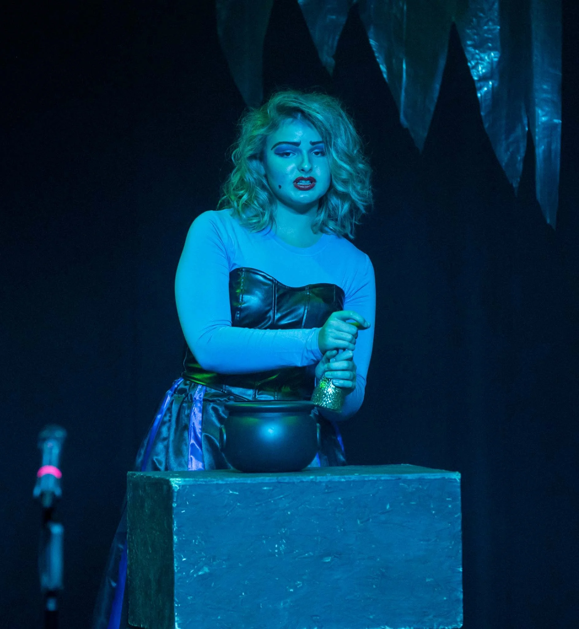 A woman with curly blonde hair is performing on stage, wearing a blue long-sleeve top and a black corset, gesturing with her hands over a cauldron on a table. The background has dark curtains and stage decorations.