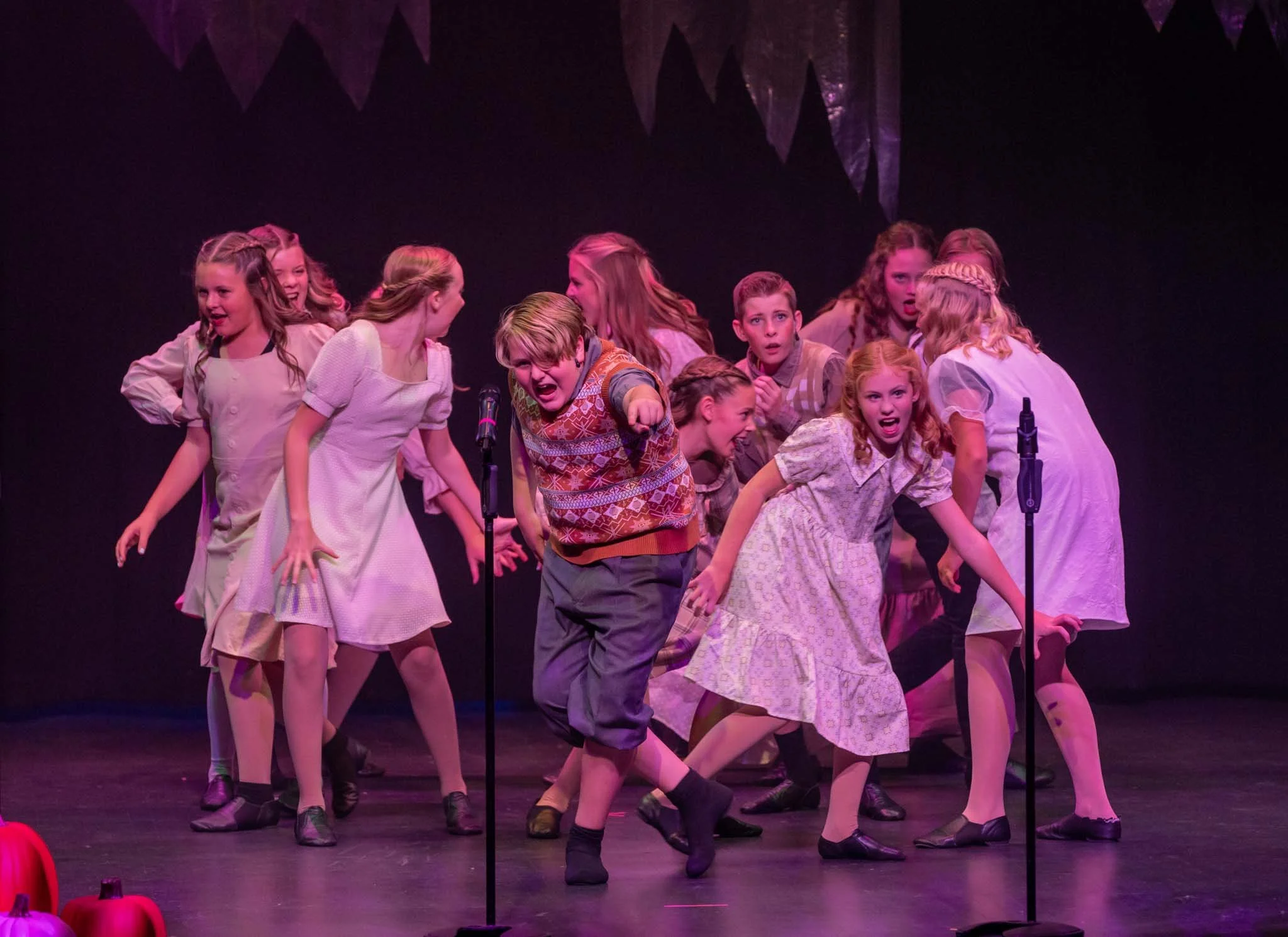 A group of young performers on stage, dressed in vintage-style costumes, engaging in a theatrical dance or musical number with microphones in front.