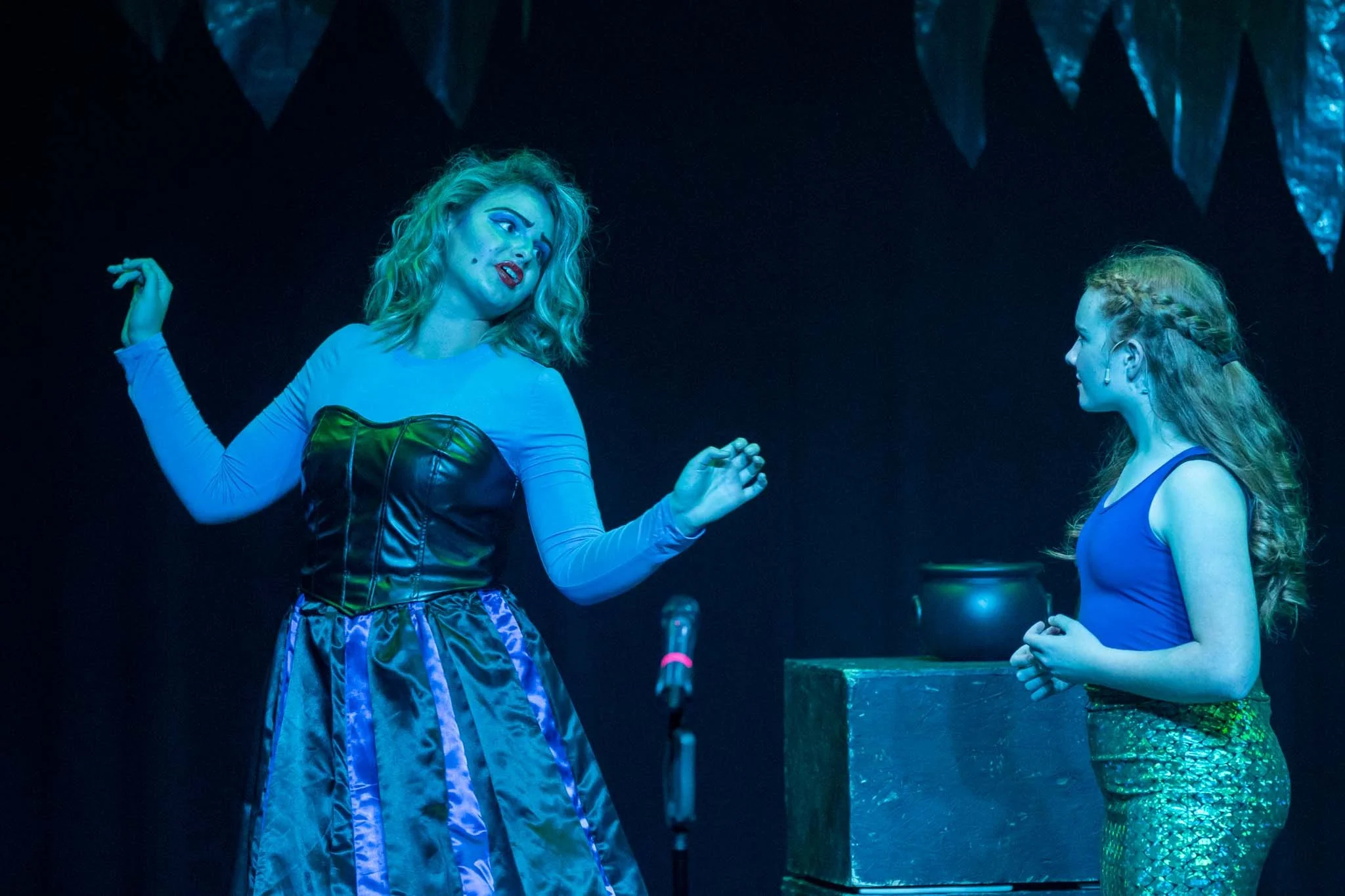 Two women on stage, one seated with long red hair and pants with a scale-like pattern, the other standing with curly blonde hair wearing a long dress with a corset top, under dramatic blue lighting.