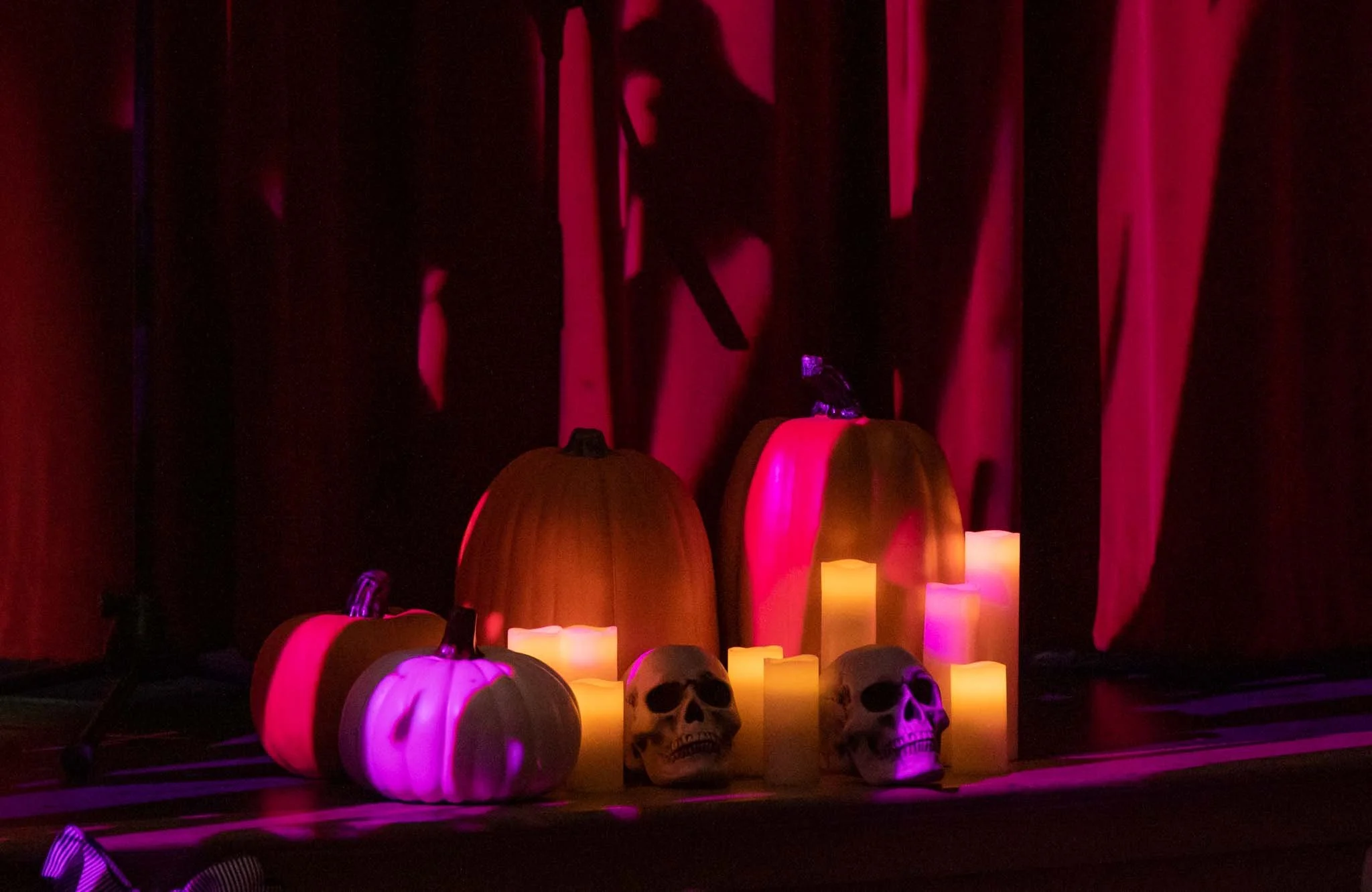 The stage of a theater decorated with pumpkins, candles, and skulls, with a closed red curtain and purple lighting.