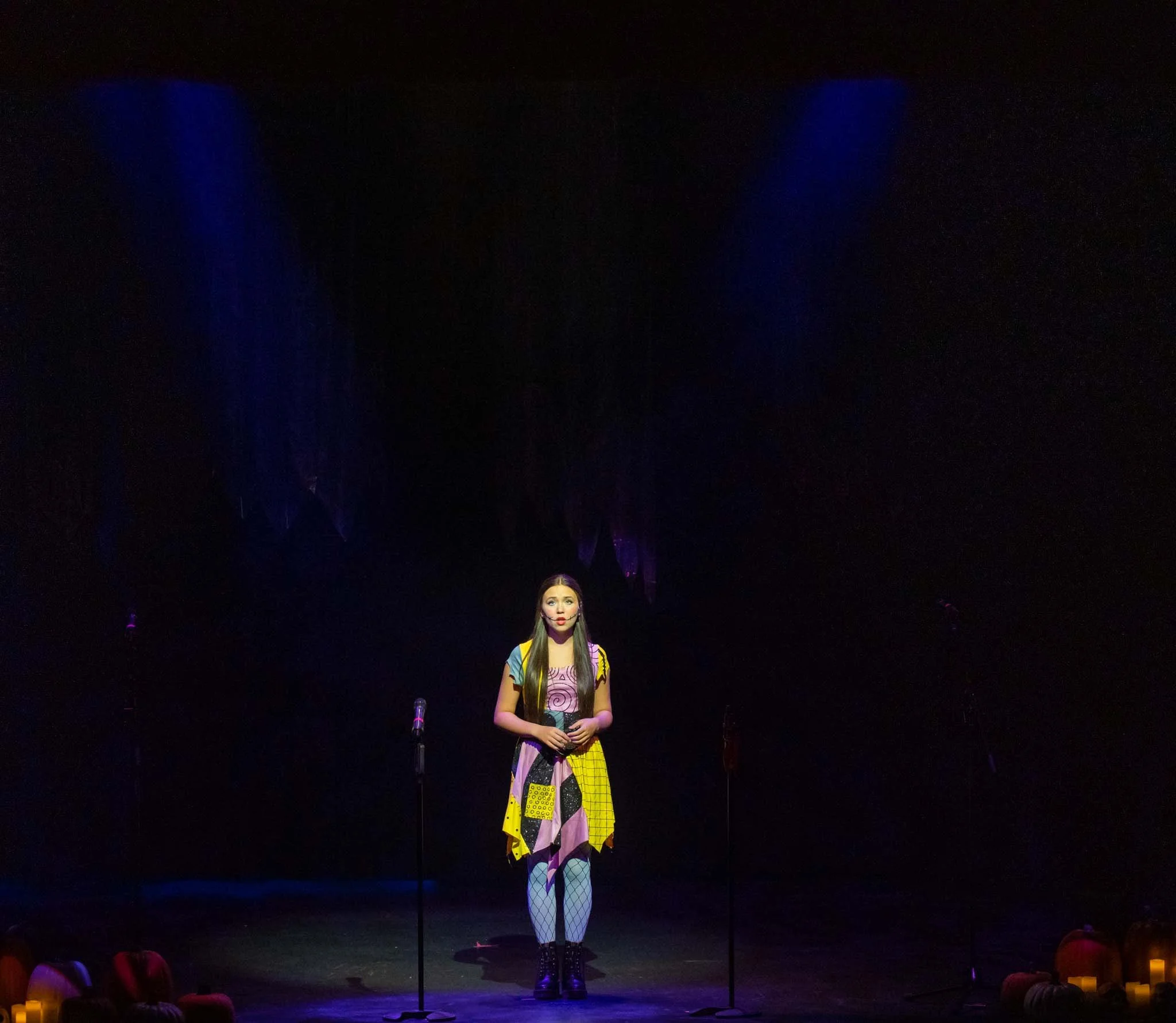 A young woman performing on stage, illuminated by purple and blue stage lights, with pumpkins at the front of the stage.